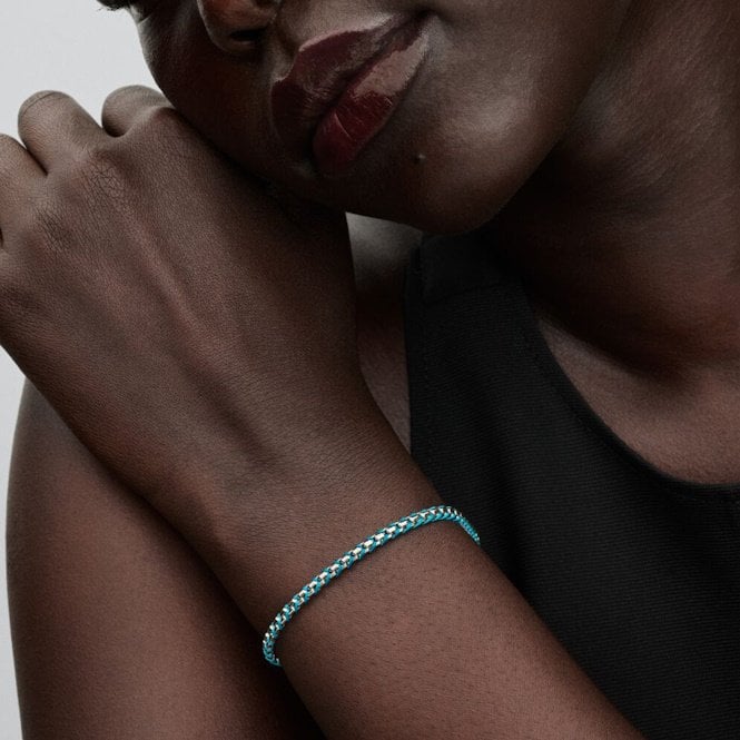 Add a pop of colour to your wrist with our Blue Cord Snake Chain Bracelet. This 21 cm bracelet from our Pandora Moments Collection combines a braided sterling silver chain with a cool, summery turquoise textile cord. It's a great way to mix textures and add something a little bit different to your usual summertime look. Wear it on its own for a subtle statement or load it up with your favourite Pandora Moments charms.