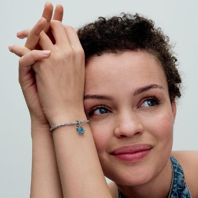 Calling all elephant lovers, this Pandora charm is the perfect way to show your love for these amazing creatures. It's a dangly charm with a sterling silver outline shaped like an elephant. Inside, there's beautiful Murano glass that blends blue and purple, making it super eye-catching! The details are awesome - the elephant has a raised ear, a cute little trunk, and even tiny feet. Plus, there's a swirly line for its tail. But wait, there's more! The top part has a row of sparkling stones and the word "LUCKY" engraved on it. This charm is more than just cute, it's a symbol of good fortune! Wouldn't it be the perfect gift for someone special (or even a little treat for yourself )?