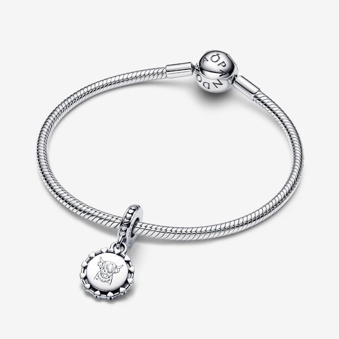 Add a touch of Scottish charm to your charm bracelet collection with one of these Engravable Scottish Cow Dangle Charms by Pandora. This sterling silver pendant charm features an outline of the famous Scottish Highland cow on one side with other polished and smooth, making it an ideal canvas for you to engrave a personal message.