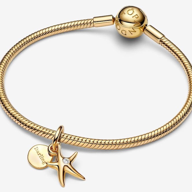 Dive into style with one of these Starfish Double Dangle Charms by Pandora. This lovely charm from their ME Collection features a beautiful starfish, a symbol of treasured times and special memories. What makes this one extra special is that you can actually add your own engraved message to it, making it a truly personal keepsake. It's set with zirconia crystal stones, which are brilliant and reflect the light beautifully with their many sparkling facets. The warm 14kt gold plating gives it a rich glow and is designed to last, thanks to the unique metal blend Pandora do underneath. These Pandora Charms make a really thoughtful gift, perfect for celebrating someone you cherish and the precious moments you share throughout the Summer.