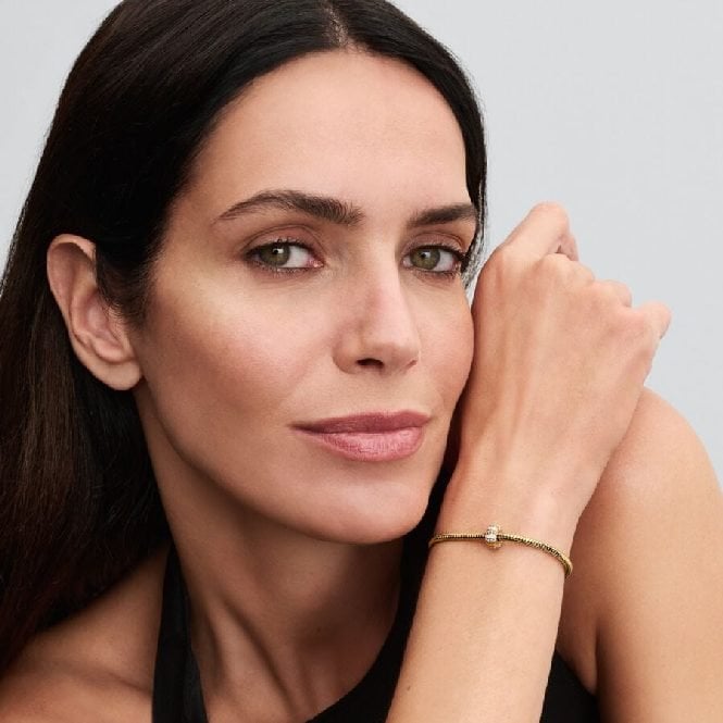Add a radiant glow to your style with our Stones & Enamel Clip Charm. This 14kt gold-plated piece features alternating lines of dazzling zirconia crystal stones and smooth white enamel, creating a striking contrast against the gold-plated setting. The silicone grips inside these Pandora clip charms ensures they stay securely in place. The design, with its blend of sparkle and shine, represents inner strength and beauty, reflecting the endless potential within you, just like the clip itself.