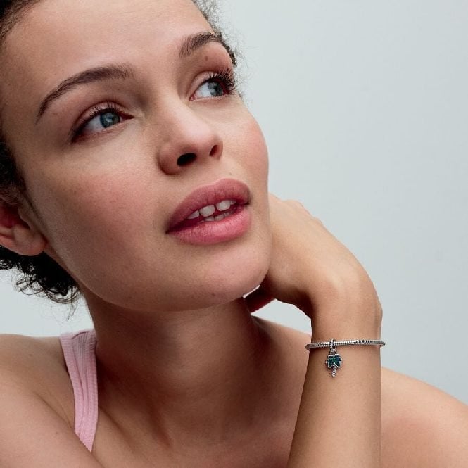 Summer vibes alert! This Pandora charm is the perfect way to add some island vibes to your bracelet. It's a dangly charm shaped like a palm tree, made from highly-polished sterling silver. One side features a gorgeous lab-created opal that shimmers with green and blue hues, like the sparkling ocean. On the other side, there's a cute little heart cutout. The base of the palm tree even has tiny sparkling stones for extra shine. This charm isn't just cute, it's a reminder to relax and soak up those good summer feelings, no matter where you are! Wouldn't it look perfect on your bracelet?