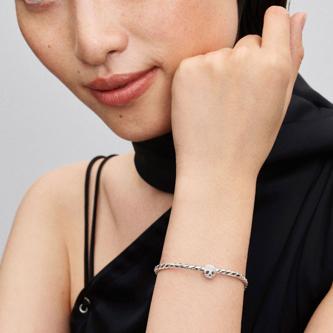 Unleash your rebellious side with the Pandora Textured Skull Mini Charm. This sterling silver charm is crafted in a classic skull shape and features their special, diamond-point textured finish, giving it a sparkling, detailed look. This Pandora charm is ideal for adding personality and edge to your jewellery.