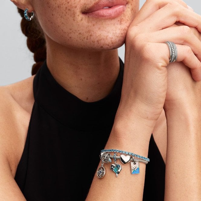 If you've got the travel bug and love to seek out new experiences, this charm is the perfect way to keep that roaming spirit close as you embark on your next adventure with our Travel Dangle Charm. This charm is a little reminder of the open road and the thrill of exploring new places. Crafted in sterling silver, our go-to for its cool, bright shine, it features a beautiful lab-created opal in shades of white and blue. This opal has a gorgeous iridescent effect, meaning it catches the light and reflects a whole rainbow of colours.