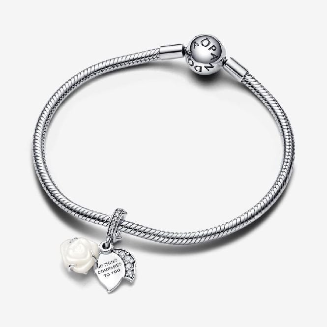 White Rose in Bloom Double Dangle Charm, sterling silver, is a piece of elegance filled with symbolism and love. A white bioresin man-made mother of pearl rose adorns the intricately designed charm. This flower captures the essence of blooming beauty with its layers of petals. The charm of this pendant charm is enhanced by clear-white zirconia crystals and is suitable for both bracelets and necklace pendants. The engraved message "NOTHING COMPARES TO YOU" adds a personal touch. This giftable Pandora Moments charm is a symbol of true love with its details, such as its thorn-adorned bail and leaf-shaped discs.