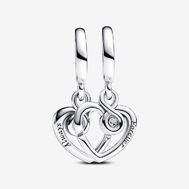 With the Pandora Forever & Always Splitable Dangle Charms, you can celebrate eternal bonds. An exquisite pendant charm meticulously crafted in 925 sterling silver. An intertwined set of two hearts encircles sparkling zirconia crystal stones in a flowing shape. The charm is engraved with the words "Always" and "Forever," expressing enduring love. Intricately designed in the shape of a heart with a cut-out, this charm allows you to attach two charms to represent unbreakable bonds. To mark an unbreakable bond, give half of it to someone special.