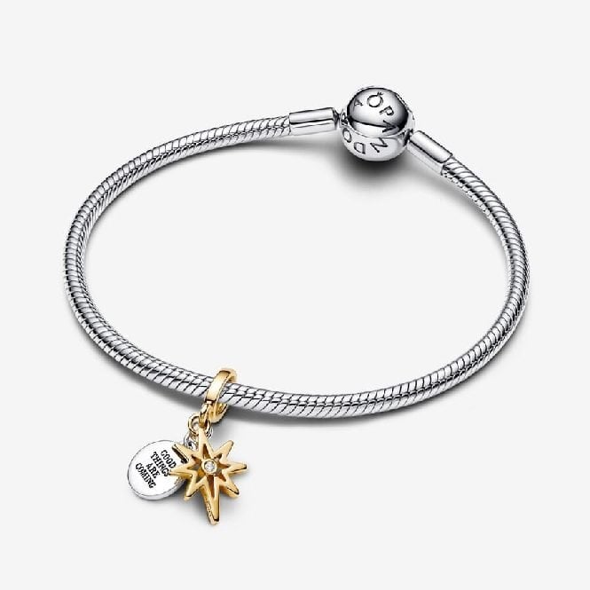 The Pandora Engravable North Star Lab-grown Diamond Dangle Charm is a beautiful way to carry your hopes and dreams wherever you go whther it's on your wrist or closer to your heart on a chain. This pendant charm features a 14kt gold-plated North Star design with a sparkling lab-grown diamond at its centre. It also includes a sterling silver disc with the engraved message "GOOD THINGS ARE COMING" on one side and a blank space on the other for your own personal message. These charms by Pandora are perfect for adding sparkle and inspiration to any and everey Moments bracelet or necklace.