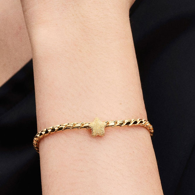 Add a celestial sparkle to your look with the Gold Textured Star Mini Charm. This petite Pandora charm is crafted from a unique alloy plated with 14kt gold, featuring a textured finish that catches the light beautifully, making this small star perfect for adding a subtle yet eye-catching detail to your bracelet charm collection.