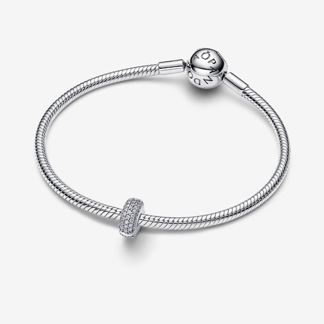 Organise your charm collection with the Pandora Pave Clip Charm. It's covered with two rows of sparkling, clear-white imitation pav茅-set crystal stones, adding brilliance and shine to your wristwear. These sterling silver charms are designed with a secure clip mechanism, allowing you to space out other charms on your bracelet to prevent them from clashing and keeping your bracelet together.