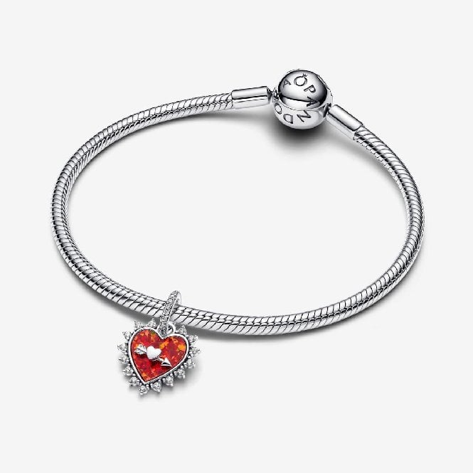Embrace a playful spirit with the Spinnable Arrow Heart Dangle Charm. Crafted from sterling silver, it features a red lab-created opal heart framed by shimmering clear cubic zirconia stones. The sterling silver arrow spins around, revealing the engraved message, "Follow your heart". The pave-set crystal stones on the encrusted bail add a marvellous level of sparkle. Wear these Pandora charms on a bracelet or necklace as a reminder to follow your heart, every day.